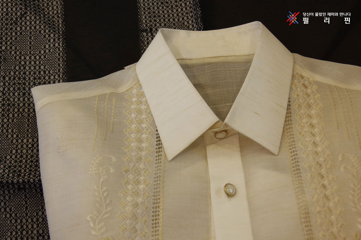 바롱은 스페인 식민지 시대부터 입기 시작한 필리핀의 전통 옷입니다. 필리핀 사람들이 격식을 갖추기 위해 착용하는 예장용 셔츠로 화려한 자수가 특징입니다. 우아하고 아름답기는 하지만 만들기가 까다로워서 일반인이 입기는 조금 힘든 옷이었다고 하죠. 그러다가 미국으로부터 독립한 뒤 라몬 막사이사이 전 대통령이 즐겨 입으면서 대중화되었다고 합니다. 사실 요즘도 필리핀에서 전통 방식으로 만든 바롱을 입기란 쉽지 않습니다. 바롱은 파인애플(피냐)이나 아바카(마닐라삼), 혹은 주시(바나나 섬유)에서 채취한 인피 섬유로 제직한 직물을 사용하여 만들기 때문에 직물을 제조하기까지 과정이 쉽지 않아서 소재 자체가 희귀한 데다가 제작과정이 대단히 복잡하고 정교하기 때문입니다. 전통 방식에 따라 만든 바롱은 가격도 상당히 고가입니다. 실크나 면, 폴리에스터 등을 섞어 만든 천이 나오면서 가격이 낮아졌지만, 그래도 필리핀 사람들은 여전히 피냐 직물로 만든 바롱을 최고로 여기는데요, 투명한 느낌이 들 정도로 얇고 가볍지만 내구성이 강하고 착용감이 좋기 때문입니다.