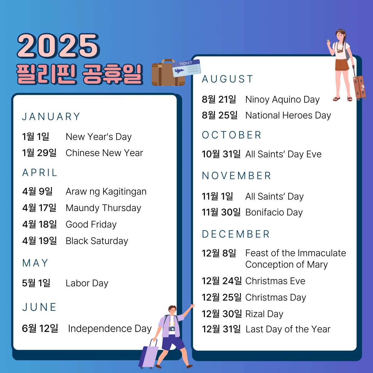 그런데 한국에서 필리핀으로 여행을 오시는 분들에게도 필리핀의 공휴일을 확인하시라고 안내해 드리는 것은 이 기간이 되면 공항은 물론이고 고속도로까지 여행객들로 가득하기 때문입니다. 게다가 필리핀 대사관과 이민국 등 주요 관공서도 모두 문을 닫기 때문에 비자 연장이니 여권 재발급 등을 하실 수 없습니다. 크리스마스 기간에는 쇼핑몰이 문을 닫거나 단축 영업을 하기도 합니다. 특히 1월 1일 오전이면 필리핀 내 주요 쇼핑몰이 모두 문을 닫아서, 외식을 한다거나 여행기념품을 구매하기가 쉽지 않습니다. 그럼 필리핀에는 어떤 공휴일이 있는지 확인해 볼까요?