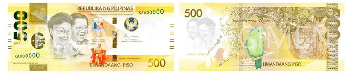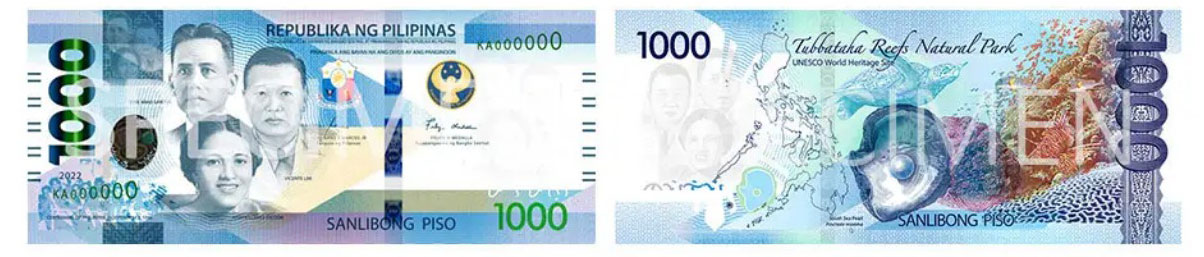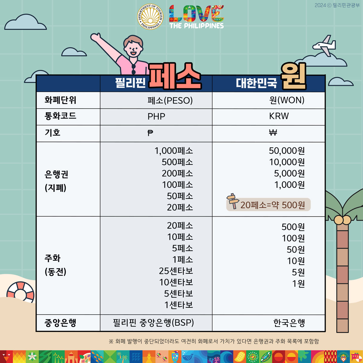 은행권(지폐) 6종: 1,000페소, 500페소, 200페소, 100페소, 50페소, 20페소 4종: 오만원권, 만원권, 오천원권, 천원권