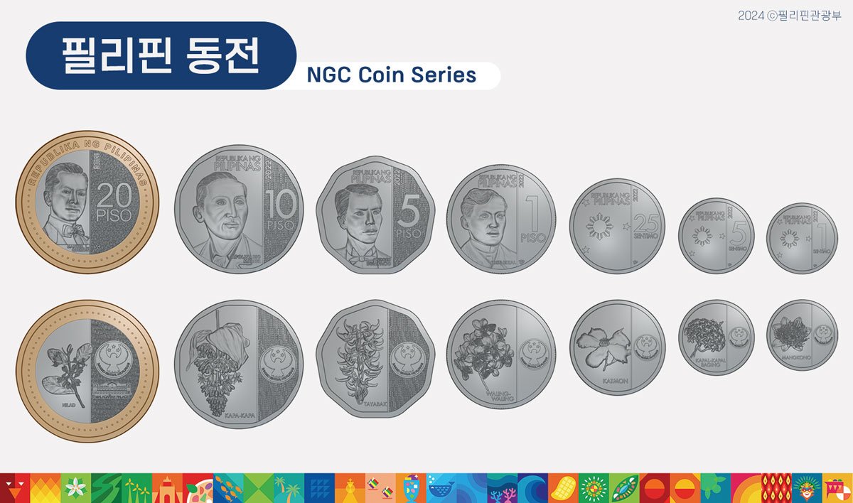 NGC Coin Series는 필리핀 중앙은행(BSP)에서 2018년 3월 26일부터 발행하기 시작한 동전 시리즈이며, 10페소, 5페소, 1페소, 25센타보, 1센타보로 구성되어 있습니다. 20페소 동전은 2019년부터 발행되기 시작했으며, 기존 20페소의 지폐의 도안의 주요 요소를 그대로 유지하면서 복제가 어렵게 다양한 위조방지 요소를 적용한 것이 특징입니다. 새로 발행된 동전 시리즈와 기존 동전 시리즈는 기존에 발행했던 동전이 자연스럽게 사라질 때까지 함께 사용됩니다.