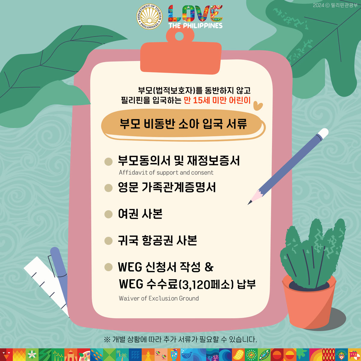 부모 비동반 소아 입국규정에 따라 만 15세 미만 어린이가 부모(친권자)나 법적보호자가 아닌 사람을 보호자로 하여 필리핀 입국을 할 경우 부모의 동의서와 가족증명서 등과 같은 서류가 필요합니다.