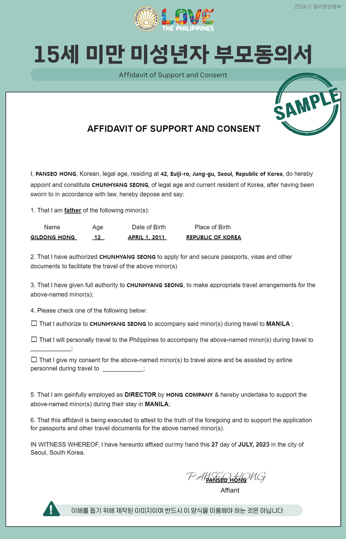 아래 첨부된 부모동의서 파일은 주한필리핀대사관에서 게시한 15세 미만 부모 미동반 동의서(Affidavit of support and consent for Koreans)를 기준으로 제작되었습니다. 서류 작성법에 대해서는 주한필리핀대사관으로 문의하시면 됩니다.