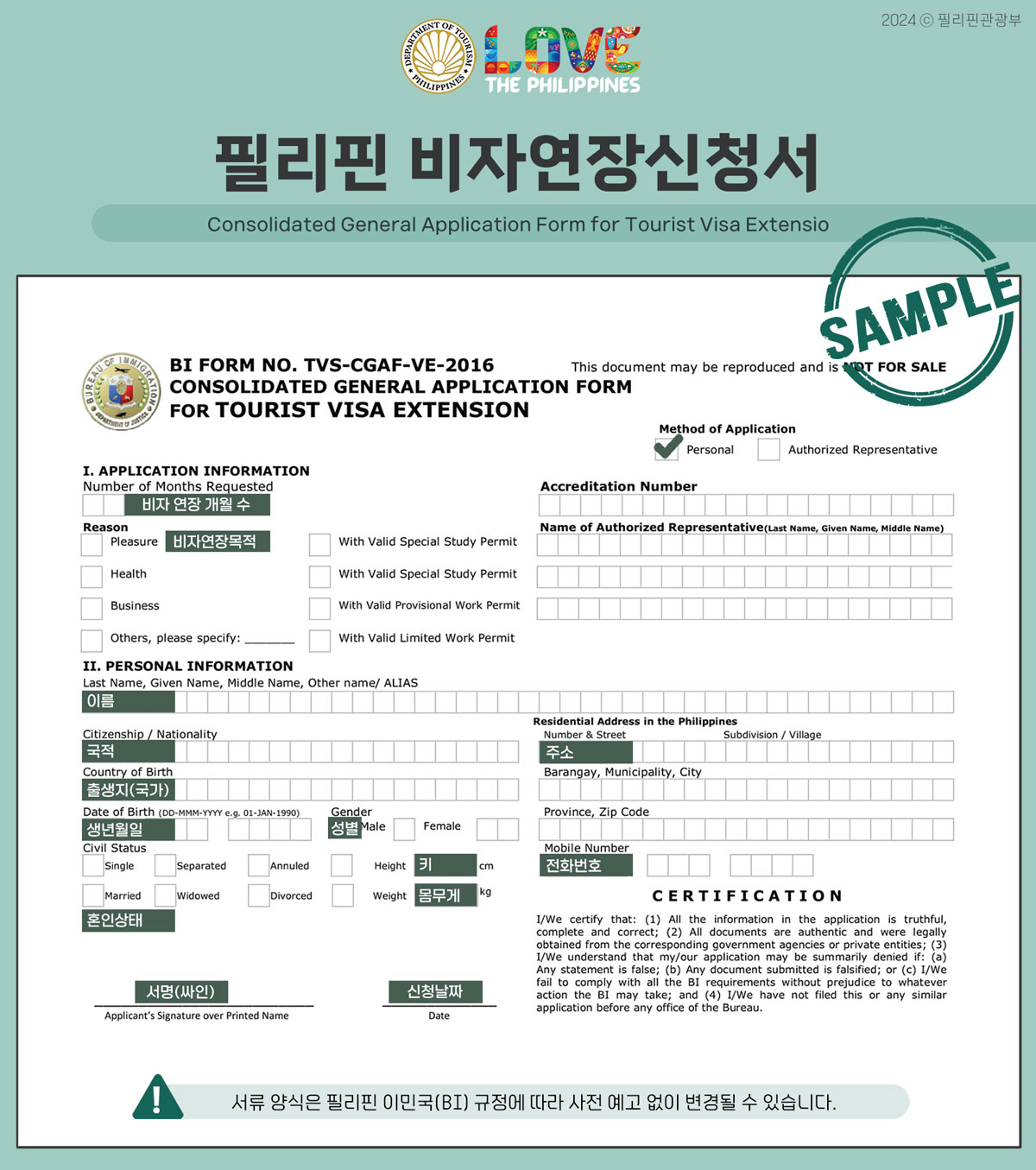 - 비자 기간이 만료되기 전에 필리핀 이민국에 방문하여 체류 기간 연장을 하셔야 하며, 체류 목적을 분명히 밝혀 주셔야 합니다.